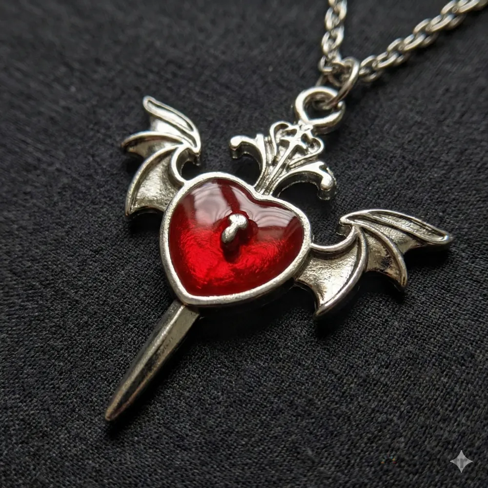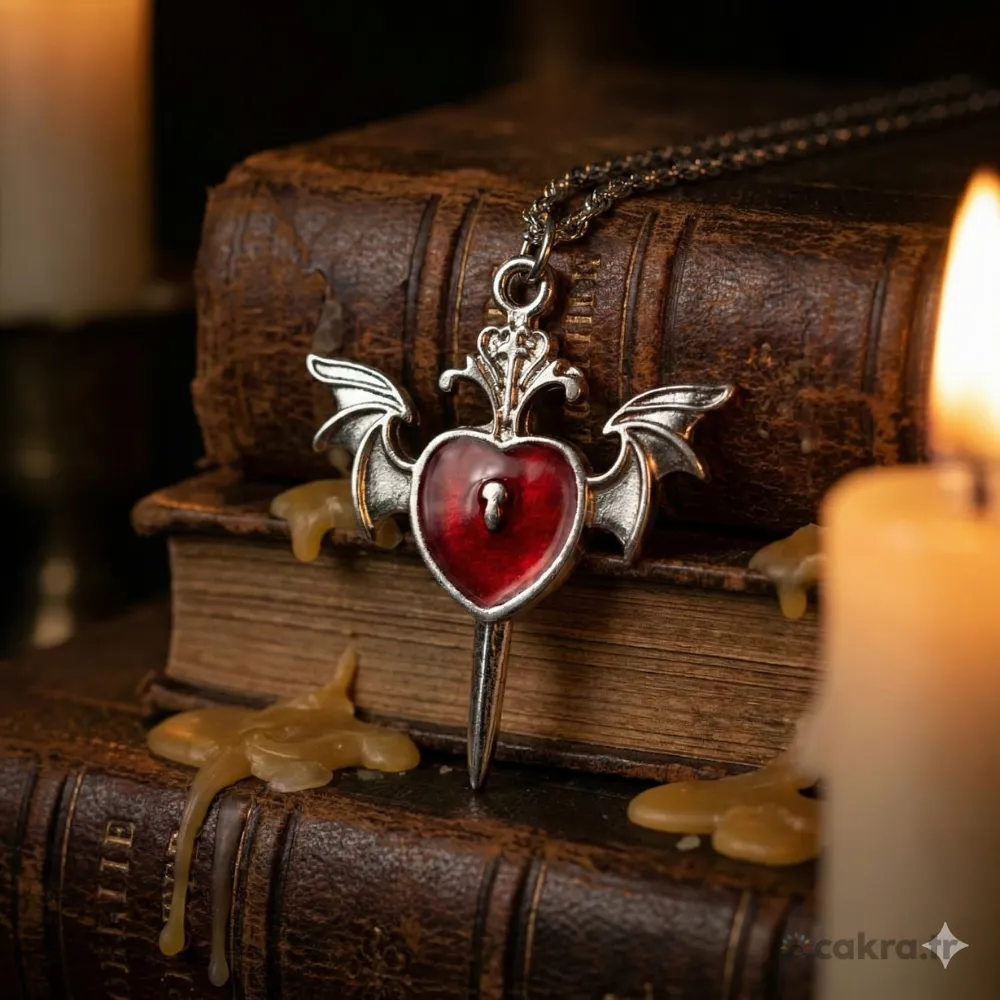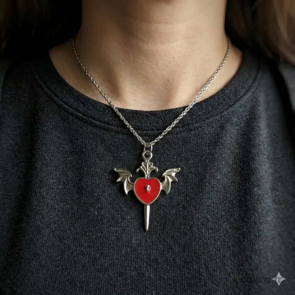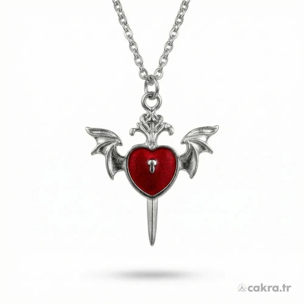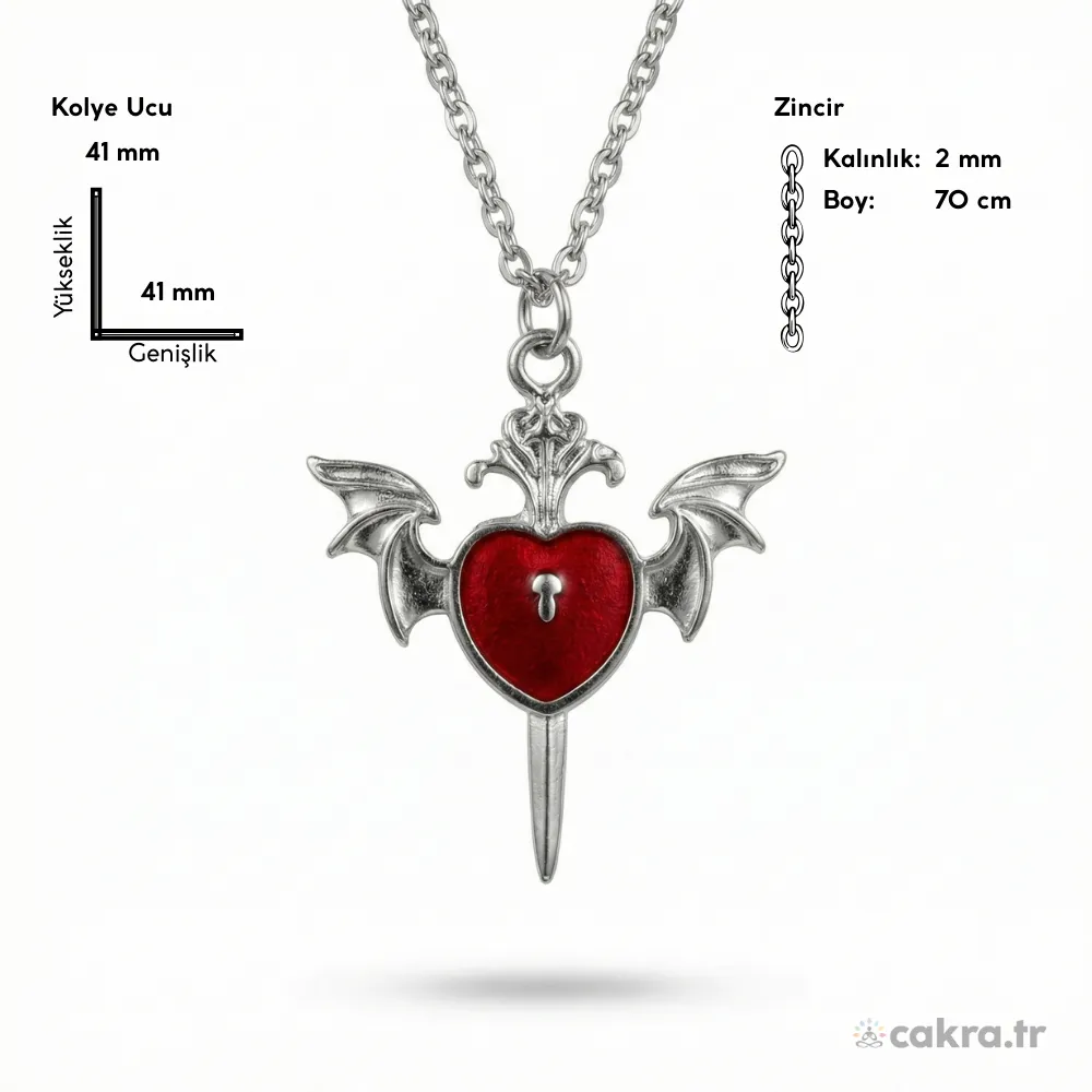 Bu benzersiz gotik kolye, karanlık romantizmin en iddialı temsilcisidir. Antik gümüş tonlarındaki gövdenin derin kırmızı ile yarattığı kontrast, her bakışta “vamp” bir zarafet sunar. 70 cm’lik uzun zinciri ve 41 mm’lik görkemli boyutuyla, en sade kombinlerinizi bile bir anda mistik bir sanat eserine dönüştürür.