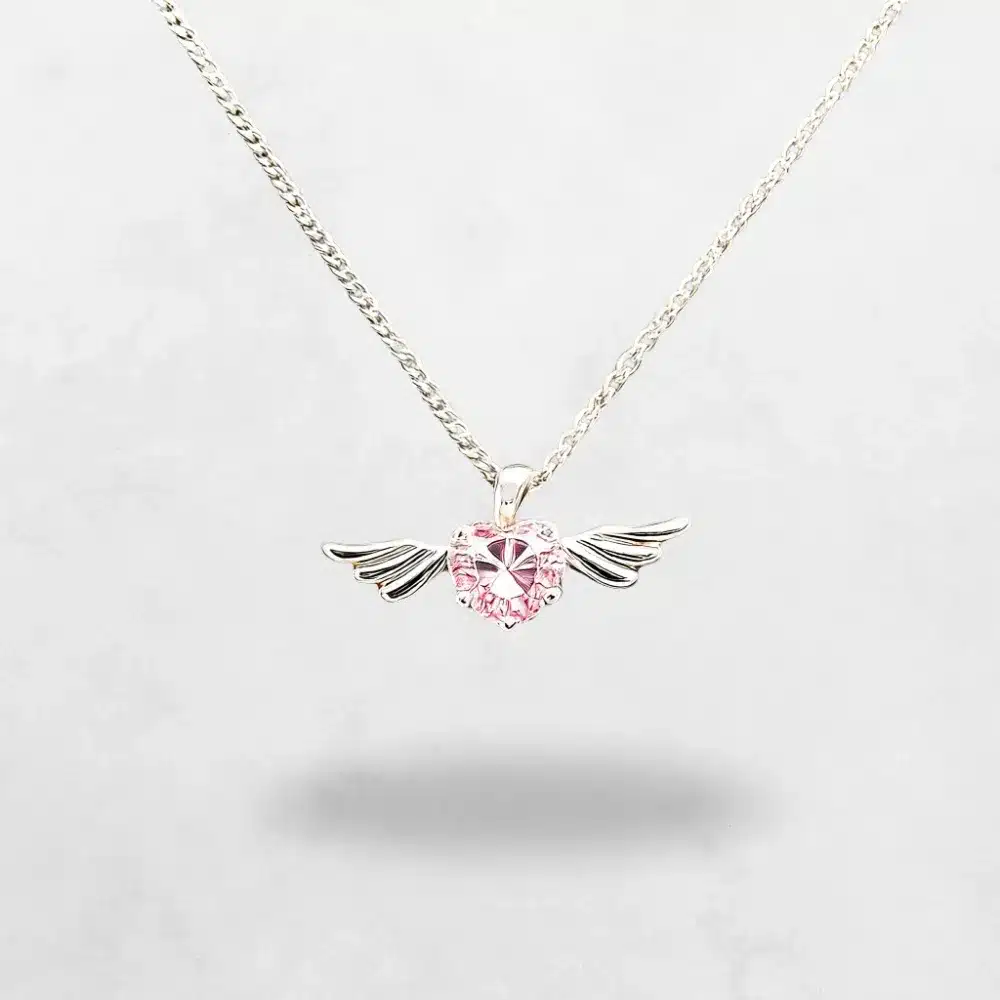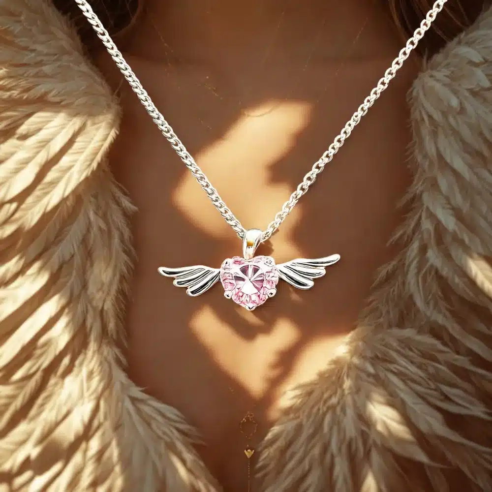 Melek Kalbi Kolyesi, premium gümüş renk kaplamayla üretilmiştir ve uzun ömürlülük ile parlak bir görünüm sunar. Kalp şeklinde pembe taş, yüksek kaliteli bir kristalden yapılmıştır ve ışığı her açıdan yansıtarak göz alıcı bir etki yaratır. Kanatlar, ince detaylarla işlenerek kolyeye zarif bir hava katar. Bu romantik takı, her bir parçasında ustalıkla işlenmiş detaylar barındırır ve günlük kullanım için dayanıklıdır.