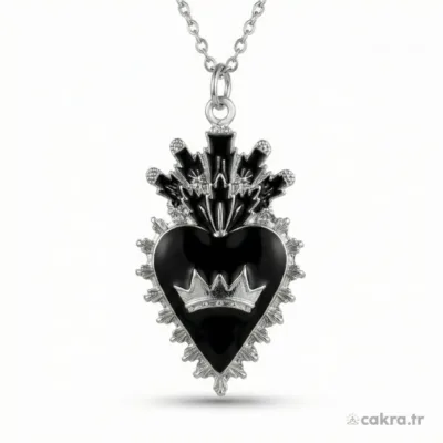 Karanlık Saltanat Kalbi - Beyaz Arka Planda Taçlı Siyah Mine Kalp KolyeKaranlık Saltanat Kolyesi Üzerindeki Taç İşlemesi ve Siyah Mine Yakın Çekim