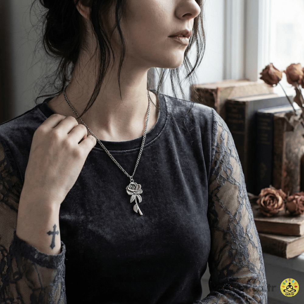 Viktoryen dönemin karanlık romantizmini ve gotik modanın asil ruhunu stilinize taşımaya hazır mısınız? Çakra Aksesuar’ın en zarif parçalarından biri olan bu tasarım, zarafeti ve gizemi boynunuzda bir sanat eseri gibi sergiliyor. Gül, yüzyıllar boyunca aşkın, hüznün ve dayanıklılığın sembolü olmuştur; bu özel döküm kolyede ise eşsiz bir derinlikle harmanlanıyor.